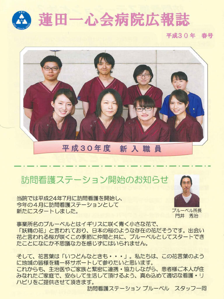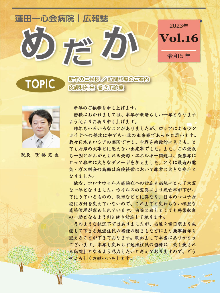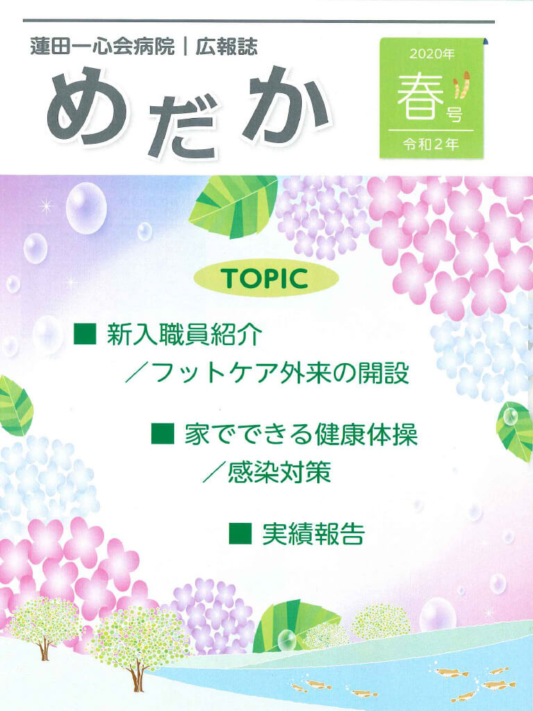 その「めだか」にあやかり、患者さんに寄り添い、「癒し」を与える広報誌ををめざし、デザインも一新、新たなスタートを切りました。今後とも地域の皆さまに役立つ情報を届けていく所存です。