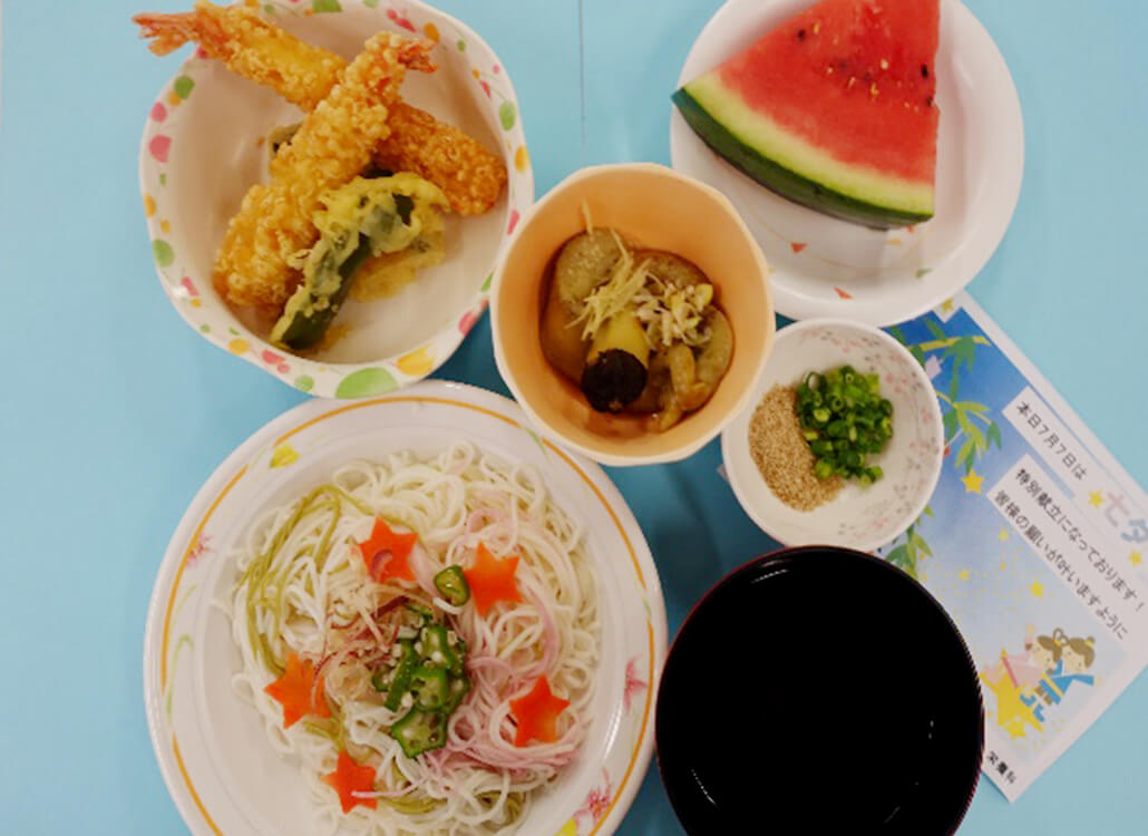 月1回の郷土料理と季節ごとの行事に合わせた献立を取り入れ食事の提供を行っています。入院生活に少しでも四季を感じて頂けるよう季節を献立に取り入れたうえでの直営給食を実施しております。