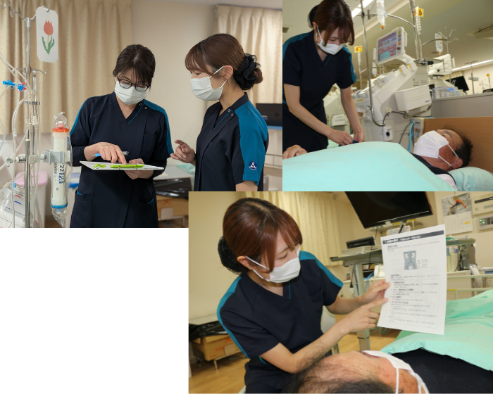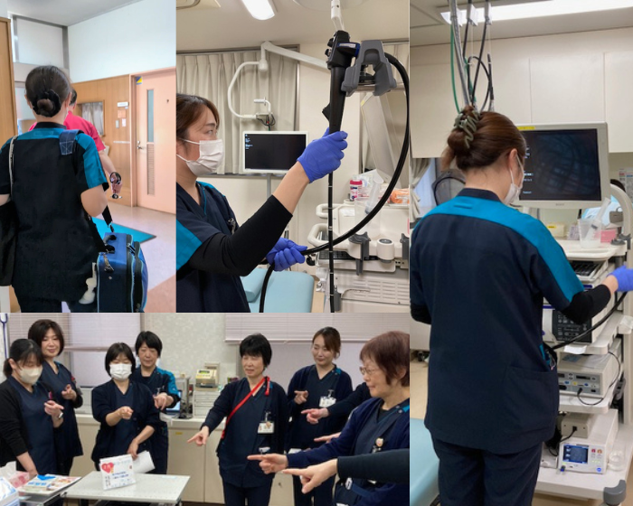 当院の看護部職員は、外来、透析、病棟、訪問看護、訪問診療、入退院支援、健診、皮膚排泄ケアの多様な場所で患者さんやご家族に寄り添い・安心して頂ける看護の提供を心がけております。
